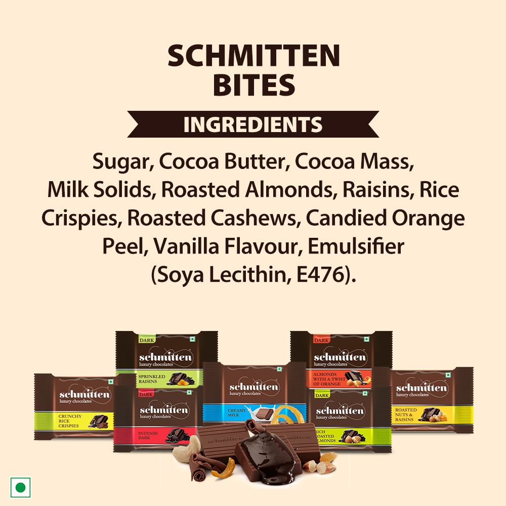 The pure ingredients are sourced from deeper African regions and parts of Europe giving international-standard taste and feel. Each Schmitten chocolate is made under the supervision of an expert chocolatier who ensures maximum hygiene and safety standards to make you surrender your senses.
